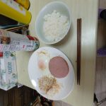 それから朝ごはんと昼ご飯にハムエッグとサラダとご飯を食べました。