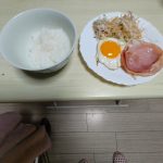その後、夕ごはんに、ハムエッグとサラダを食べました。
